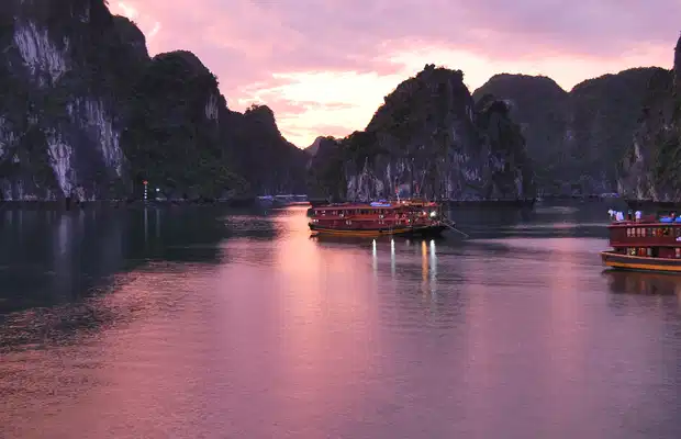 Nous embarquons sur la jonque Huong Hai amarée tout au bout du quai au milieu des nombreuses autres jonques . Nous allons y passer la nuit et sommes impatients de voir notre cabine . Très agréable surprise : Deux lits joliment arrangés une petite armoire en bambou et une salle d'eau avec douche .