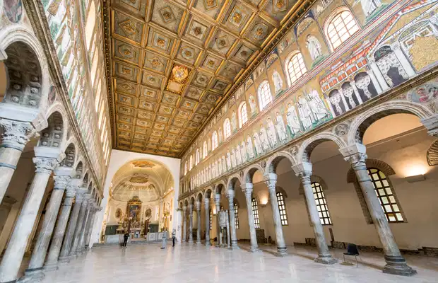L’église de San Apolinar Nuovo a une large nef qui se termine par une abside semi-circulaire. Elle dispose également de douze paires de colonnes supportant des arcs. Comme toutes les églises de Ravenne, vous pouvez trouver quelques magnifiques mosaïques. Les trois figures des Mages sur le mur sont jolies.
