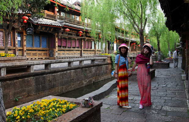La vieille ville de Lijiang est comparée à un encrier renversé car, comme l'encre s'écoule dans plusieurs directions, la vieille ville est sillonnée de petits canaux. D'anciennes roues à aube, par le passé, actionnaient des moulins à papier. Ponts de pierre en arche ou passerelles de bois ; restaurants en terrasse et multitude de saules savamment taillés. Certes, pas la moindre barque ni gondole : les chenaux sont étroits, mais la poésie conférée au lacis de venelles est indéniable.