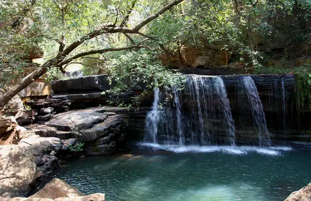 Il suffit, après s'être acquitté d'un droit de visite, de parcourir une centaine de mètres pour atteindre une première chute plus large que haute. On grimpe entre les rochers et on arrive au niveau d'une piscine naturelle alimentée par une belle chute verticale de 20 mètres. Il est des jeunes gens pour se proposer en plongeon spectaculaire mais j'ai décliné leur offre.