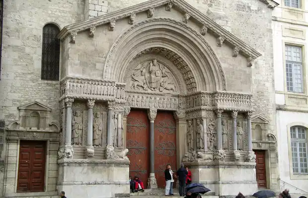 Trophime, qui a donné son nom à cette église romane, fut le premier évêque d'Arles. Comme nous sommes dans le sud de la France, les édifices religieux n'ont pas subi les bombardements des deux guerres mondiales du 20ème siècle, et on a un portail roman de toute beauté qui s'ouvre à la manière d'un arc de triomphe romain.