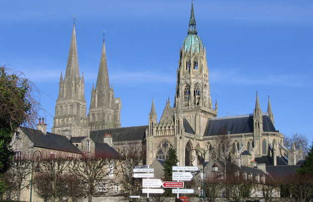 C'est dans le Trésor de cette magnifique cathédrale qu'a été conservée la célèbre tapisserie de Bayeux jusqu'à la fin du XVIIIe siècle. La cathédrale actuelle comporte des éléments d'architecture romane datant du XIe siècle, dont la crypte et les tours de la partie occidentale, mais le reste de l'architecture est surtout gothique suite au dernier chantier commencé au XIIe siècle et qui ne se termina qu'au XVe siècle.