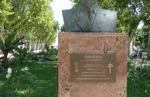 Sur la même allée que la sculpture nommé "le vent", il y en aussi une de Charles de Gaulle. C'est un portrait réaliste posé sur un socle. Le tout demeure assez froid et n'a pas vraiment de vivacité ! Du coup on ne fait pas forcément attention au portrait. Ce buste est en bronze et il fut réalisé par Hugues Malbreil. Cette statue est un hommage au président de la République. Sous le buste et sur le socle, il y a un écrit relatant ce qu'il a fait en l'honneur pour la France. Il fallait bien que l'esplanade qui porte son nom ait une sculpture de lui !