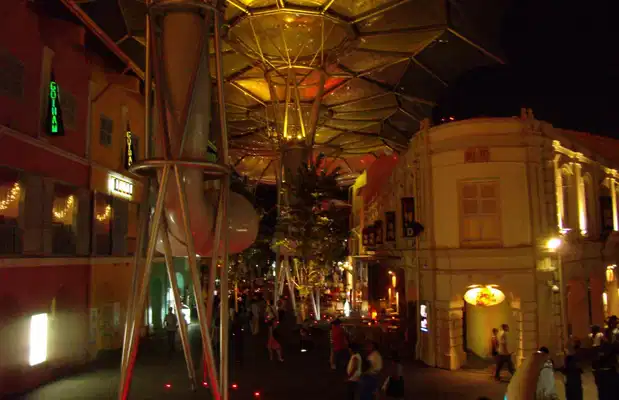 Situé sur les rives du fleuve de Singapour, cet endroit est l'un des sites les plus importants du Singapour au moins pour deux raisons: à cause de sa célébrité et l'existence des restaurants les plus variés, des bars et des magasins dont il dispose. Tous ceux-ci attirent les touristes. Toutes les nuits, on peut y trouver les plus importantes maisons de jeu de cette ville la plus connue dans le monde. C'est un endroit que vous devez connaître. Ce qui m'a surpris c'est cette énorme structure en forme de champignon pour se protéger du soleil et de la pluie, et aussi pour se rafraîchir un peu.