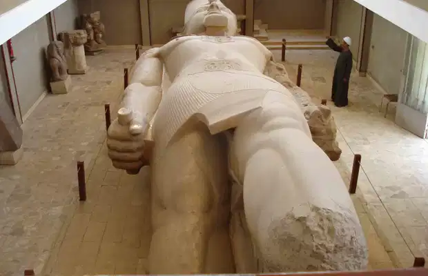 La statue de Ramsès II, c'est l'objet le plus attrayant qui soit resté de l'ancienne capitale du nord de l'Egypte, à Memphis. Une énorme statue qui a été très bien conservée, sauf pour les pieds qu'elle a perdu au fil du temps. Ramsès II est l'un des pharaons les plus célèbres en raison de son caractère guerrier et bâtisseur, ce qui l'a fait être présent dans une bonne poignée de temples le long de toute l'Egypte.