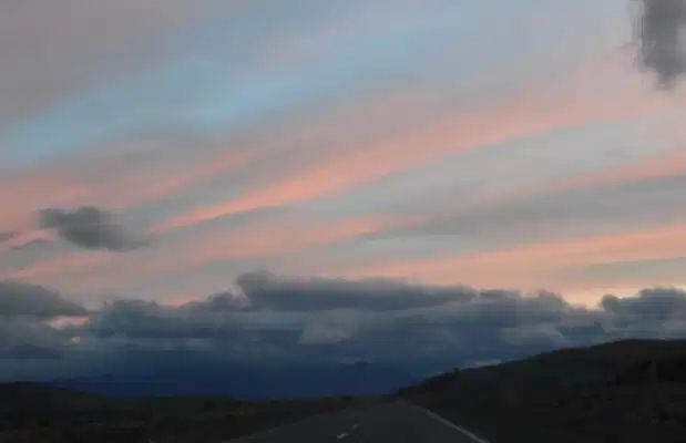 Si la route depuis Bariloche vers la vallée enchantée était déjà très belle dans un sens, le retour avec le coucher de soleil en ligne de mire n'a pas de prix. Les montagnes s'habillent des plus belles couleurs qu'on puisse imaginer : roses, orangées, avec des morceaux de ciel bleu résistants à l'arrivée de la nuit. Certainement l'un des plus beaux couchers de soleil de notre séjour.