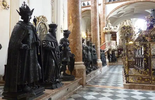 Face au Palais Imperial de Innsbruck se trouve l'Église impériale ou la Cour qui abrite le mausolée vide de l'empereur Maximilien Ier, le monument funéraire impérial le plus important d'Europe. Le cénotaphe est maintenu par 28 statues de bronze et 24 reliefs en marbre qui représentant des scènes de sa vie. Chaque statue mesure environ 2 mètres de hauteur et pèse presque 2 tonnes. Elles représentent les ancêtres et la famille de l'empereur, en passant par son père jusqu'aux autres membres de sa famille issue de la haute noblesse, comme le Roi Arthur d'Angleterre. De plus, Andreas Hofer, chef de