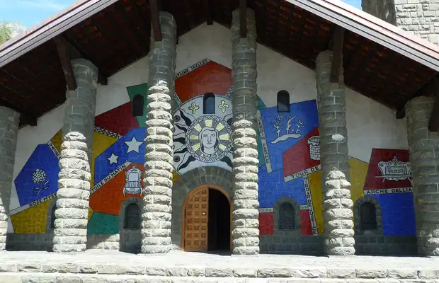 Née d'une idée pour le moins originale, afin d'offrir une église aux fidèles en cure de sanatorium sur ces hauteurs de Chamonix, on fit appel à des artistes du 20ème siècle, quelles que fussent leurs croyances. Et quels artistes ! Fernand Léger pour la façade ; Matisse, Braque, Lurçat, Bonnard pour la décoration intérieure ; Chagall pour la chapelle des Fonds Baptismaux ; Rouault pour des vitraux ainsi que quelques autres, je ne les citerai pas tous, mais il faut mentionner aussi les poutres de la charpente et la crypte.