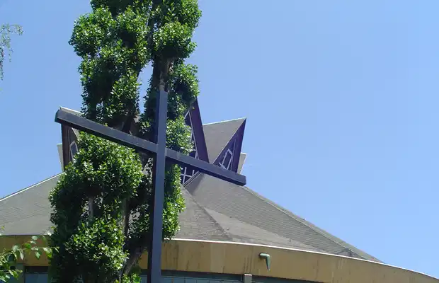 En empruntant le long boulevard Joseph Vallier on ne peut manquer de surpris par cette masse noire ressemblant à un vaisseau extraterrestre qui surgit d’entre deux immeubles. Au première vue on devine une salle de concert ou un équipement originale mais en y regardant d’un peu plus près on voit les croix disposer de parte et d’autre du bâtiment… Le doute persiste mais c’est bien une église. De forme circulaire et avec une toiture noire formant, tel une couronne, des piques à son sommet l’Eglise Saint Jean XXIII à un style bien à elle et quasi indescriptible qui la rend très atypique. Il en va de
