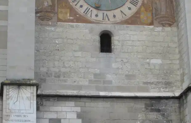 Un peu en dessous, un petit cadran solaire, et, enfin et surtout, observez bien la flèche du clocher de l’église.