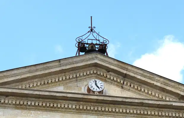 Son architecture est singulière, composée de grandes colonnes et de portes et vitraux de style roman. Tout en haut, on peut apercevoir 3 petites cloches ainsi qu'une horloge.