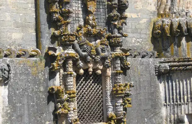 Il s'agit de la sculpture manuéline la plus fascinante du Portugal. Réalisée en 1510 et située dans le Couvent du Christ à Tomar, au Portugal. Elle incarne à la perfection l'art manuélin, où l'exaltation du monde végétal atteint le maximum, un style unique du Portugal. La mousse permet d'accroître son épaisseur et son relief. Noeuds, cordes tordues, rubans torsadés de racines complexes ... Elle est chargée de symbolisme: à droite algues liées par un lien, dans le hublot, dans la partie supérieure, les cordages attachent les voiles gonflées... Depuis le cloître de Santa Barbara il y a une très bonne vue de la Fenêtre.