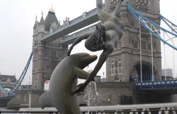 Cette fontaine est à côté du Tower Bridge de Londres, et représente une fille sautant de l’eau avec un dauphin. La statue paraît heureuse, et complètement hors du commun, à côté de l’ancienne tour. Il semble que la fille danse avec le dauphin, en parfaite harmonie. La fontaine fait partie des différentes décorations qui ont été placées au bord de la Tamise, pour transformer le lieu en une promenade piétonnière agréable. Il y a une horloge solaire, plusieurs sculptures d’artistes anglais modernes, qui font des docks un cadre moderne et joli.