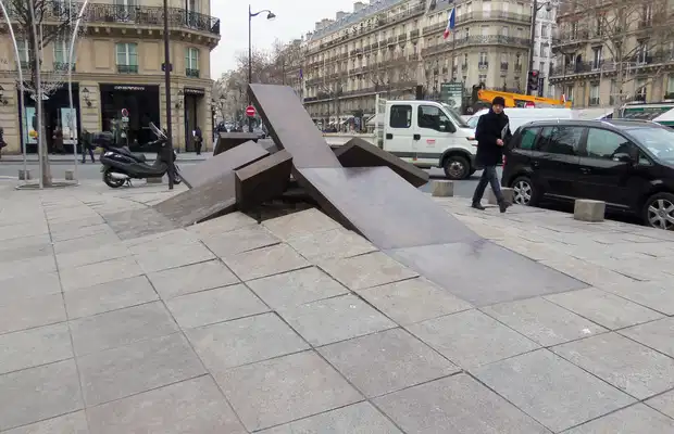 Si je ne me suis rendue compte que récemment que cette œuvre était non seulement une sculpture mais aussi une fontaine, l’impression qu’elle me procure n'en est que renforcée : Il semble véritablement que le sol se soulève et se fende sous une pression souterraine. Elle a ainsi pour vocation de symboliser la fonte des glaces à la fin de l’hiver et les amoncellements de glaces flottants sur l’eau à cette époque de l’année au Québec, d’où son nom « L’Embâcle ». Car nous sommes ici sur la place du Québec, et l’artiste qui a réalisé cette œuvre, Charles Daudelin est lui aussi québécois.