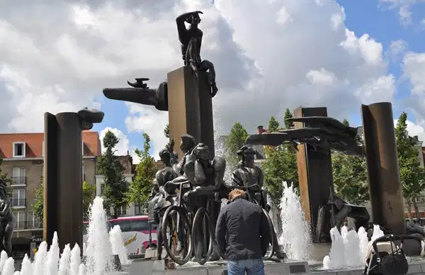 La fontaine de la place Le Sablon (t’Zand) est pour le moins impressionnante. Cette œuvre du couple d’artistes Stephan Depuydt et Livia Canestrano évoquent des pans de l’Histoire de Bruges. Les femmes représentent les grandes villes flamandes, Gand, Anvers, Courtrai et Bruges. Les pêcheurs rappellent les liens de Bruges avec la mer tandis que les cyclistes sont observés par Till l’espiègle, un personnage farceur du nord de l’Allemagne qui a inspiré des poètes, écrivains et musiciens comme un être qui a l’habitude de prendre les expressions figurées au pied de la lettre.