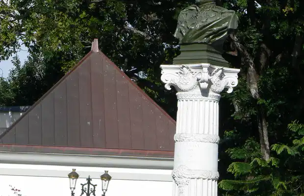Juste en face de l'entrée principale du jardin de l'Etat il y a une statue de François Gédéon Bailly de Monthion. La sculpture en bronze trône sur une colonne en plein milieu du carrefour. En fait cet illustre personnage a trouvé sa place ici car ce général de division est né à Saint Denis le 27 Janvier 1776. Mais il est mort à Paris en 1850. On ne sait pas qui est l'auteur de ce portrait par contre ! En tout cas c'est rare de trouver un tel socle : Celui ci est une colonne raffinement travaillé.