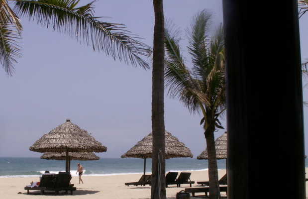 Nous sommes sur la côte est sur la mer de Chine , la plage est immense et l'eau à 25° . Ce jour la quelques vagues bien formées mais le lendemain calme plat . Seuls quelques touristes se baignent car il n'est pas de bon ton pour les jeunes filles Viêtnamiennes d'avoir la peau Hâlée , au contraire plus elles sont blanches plus elle ont du succès.