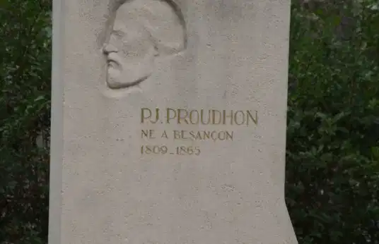 Sur sa base, on remarque un profil aussi chiche de détails, une barbe, une raie en arrière et l’on dresse le portrait de Pierre-joseph Proudhon, bisontin et premier anarchiste du pays qui lutta activement contre la notion de propriété. Le lien avec la sculpture prend tout son sens : Le gruyère représente le fardeau de la propriété écrasant l’homme.
