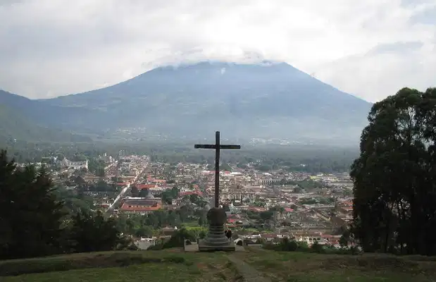 Le cerro de la Cruz (montagne de la croix) domine Antigua Guatemala dans le département de Sacatepéquez. C´est un endroit vraiment sympa pour voir la ville coloniale d´en haut, ses toits de tuile rouge où poussent parfois des arbres, les maisons rouges, jaunes, bleues, les ruines des vieilles églises et couvents, et les trois volcans qui entourent l´ancienne capitale du Guatemala.