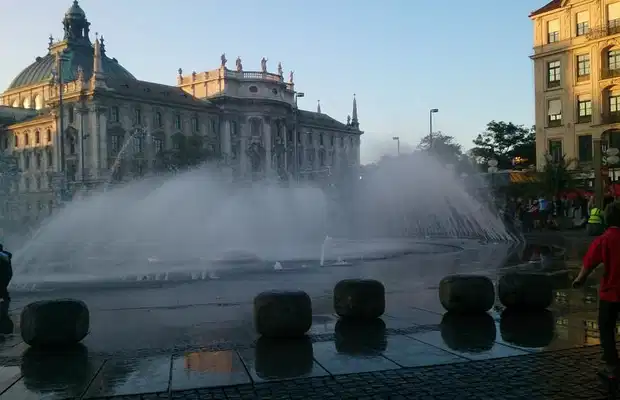 Certainement notre fontaine préférée à Munich, car nous avons eu la chance de la découvrir au coucher du soleil. Quelques esprits éméchés par les litres de bière de l’oktoberfest ont rendus le clicher plus intense puisqu’ils s’amusaient à traverser les jets d’eau le plus vite possible. Ca a au moins eu le mérite de les réveiller un peu !