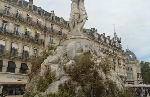 Plantée au milieu de la place de la Comédie, en plein centre-ville de Montpellier, la fontaine des Trois Graces, taillée dans un même bloc de marbre, représentent trois vierges et des anges rieurs et se retrouve souvent assaillie les soirs de matchs de foot ou juste le samedi quand les étudiants ont un peu trop bu.
