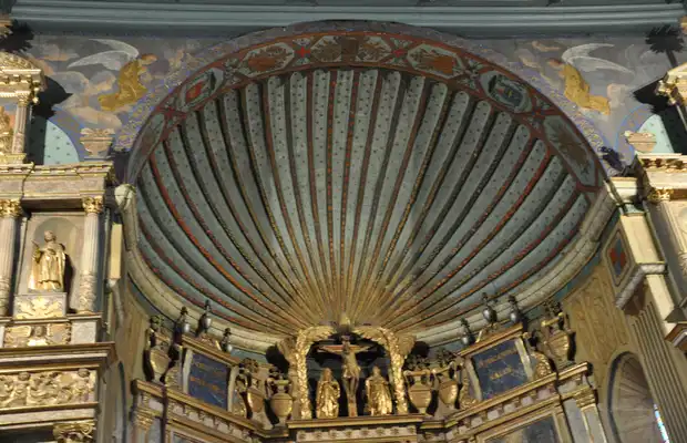 Saint-Pée-Sur-Nivelle est un lieu de passage secondaire du Chemin de Saint-Jacques de Compostelle. Lors de ma balade dans la jolie ville basque, je me suis arrêtée dans l'église Saint-Pierre qui renferme un magnifique retable du 18ème siècle, des tribunes en bois et des dalles funéraires. Cette dernière possède aussi une très belle voûte à nervures en forme de coquille Saint-Jacques en souvenir du passage des pèlerins ! Les boiseries sont à dominante bleues et dorées et parsemées d'étoiles... C'est assez surprenant :)