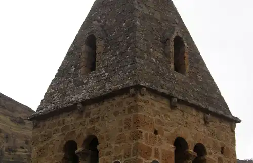 Ambiance romantique : un petit cimetière ceinture l'église. Le tuf jaunit au couchant qui se joue de l'ombre dans les baies géminées et met en valeur les têtes sculptées de la corniche supérieure.