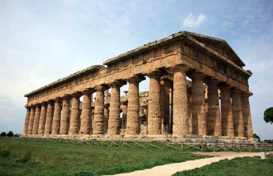 La cité de Paestum est lieu archéologique exceptionnel. C'est là que, selon moi, on trouve les plus beaux temples grecs, construits dans un calcaire qui se dore au couchant. Les Grecs ont, en effet, colonisé le sud de l'Italie. Trois temples ont été remontés dans un environnement paysager de cyprès, de lauriers roses et d'aspholèdes, du plus bel effet photogénique. Le plus célèbre, avec son fronton triangulaire est de pur style dorique ; on le pense consacré à Héra(après l'avoir attribué à Poseidon). Un musée , de petite taille, présente notamment des peintures de tombes dans un exceptionnel état de conservation : scènes de banquet, plongeur.