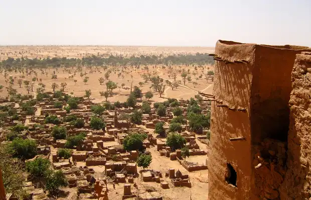 Sangha, au cœur du pays Dogon, constitue un regroupement de plusieurs dizaines de villages. Dix s'échelonnent sur le plateau de grès au relief heurté, tandis que les autres gravitent à l'assaut de la longue falaise, laquelle, de son à-pic de plus de 300 mètres, domine la plaine sablonneuse du Séno. Les Dogons constituent une population qui, longtemps, a vécu à l'écart de toute influence extérieure, avec ses propres rites civils et religieux. Villages hors du temps, omniprésence du sacré, rusticité laborieuse au contact de la nature. Mais l'Histoire est en marche, le progrès arrive avec ses générateurs électriques et la venue de touristes, chaque année plus nombreux, bouleverse la tradition.