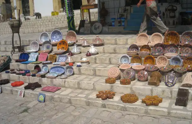 Le souk se trouve à Médina. Nous arrivons en taxi et aussitôt, nous sentons l'atmosphère des rues qui monte et qui descend. De plus, il cache et écarte les affaires secrètes. Certains commerçants exposent leurs céramiques au sol, tandis que d'autres mangent du couscous avec quelque chose dans des énormes assiettes tout en nous regardant passer. "Allez, sortez la caméra!", me dit-on, mais j'ai répondu de la laisser dans le sac car avec cette foule, elle pouvait disparaitre rapidement. A un certain moment, on nous a même pris par les bras pour que nous entrions dans un étalage. "Ne me touche pas!", dis-je, mais sans succès.