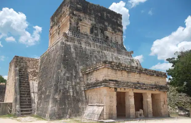 Le temple tire son nom d'une séquence de jaguars sculptés. Présidé par deux colonnes en pierre avec de grandes serpent à plumes, ce temple est construit fixé au mur à l'Est de la Cour du jeu de pelote. Il se compose de différentes couches qui sont finement sculptés et montrant différents types d'images qui, ensemble, peuvent être interprétés comme l'histoire de la création de Chichen Itza. Deux énormes serpents (animal sacré des mayas ) à plumes sont sculptés sur les colonnes dans le hall d'entrée.