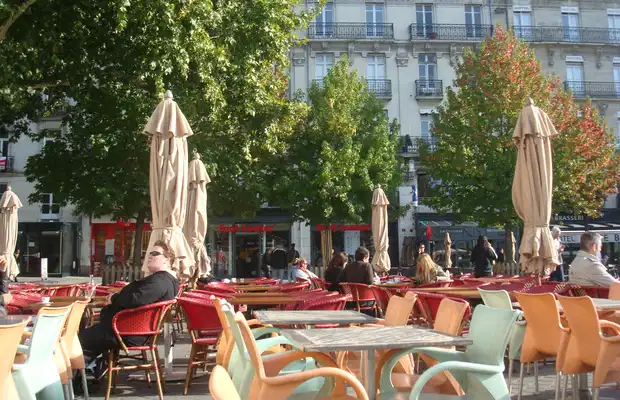 Un matin ensoleillé d'automne, la place du Commerce se réveille doucement, les terrasses sont déjà installées mais encore vides... Le soleil s'élève juste en face, du côté de la place sans façade, ouverte vers la ligne de tram (arrêt Commerce). Quoi de plus agréable que de s'installer à une de ces terrasses, boire un grand café pour s'éveiller doucement au rythme de la ville ? Il y a bien 6 cafés différents, Café de la Bourse, La Coquille, café de l'Europe, le Maléo... Bref, un petit moment de tranquillité avant d'aller faire un tour à la Fnac ou bien continuer à découvrir les rues de Nantes en remontant vers la place Royale...