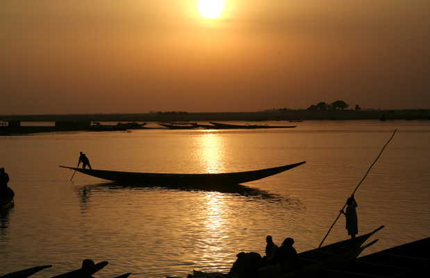 Niger : artère commerciale, voie de communication primordiale à Mopti. Les pinasses n'arrêtent pas de faire un va-et-vient entre les deux rives, jusqu'à la nuit tombée. Ces pirogues, très effilées, ont souvent la proue peinte de couleurs vives. Si vous voulez vous rendre d'un bout de Mopti à l'autre, en longeant le fleuve, une balade en pirogue est plus rapide qu'un taxi !