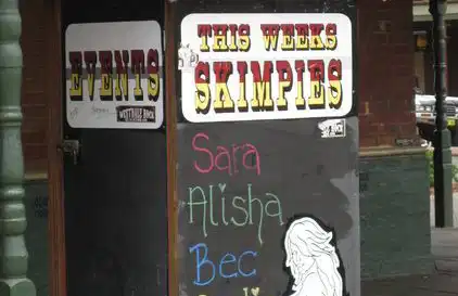 Généralement en bikini, ou en tenue affriolante, la skimpy est une jeune fille, souvent un étudiante qui vient de Perth ou Sidney pour un ou deux mois, et qui chaque semaine vient travailler pour un pub différent.