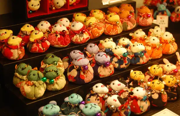 Kyoto est la ville qui reçoit le plus de tourisme au Japon (local et étranger)et, par conséquent, les boutiques de souvenirs abondent. Même s'il y a des magasins de son genre dans toutes les villes touristiques du monde, je crois que ceux de Kyoto méritent une mention spéciale, pas pour les objets qu'ils vendent, mais par leurs couleurs et leurs soucis du détail. Les plus sympa sont ceux dans les rues qui grimpent vers le fameux temple de Kiyomizudera.