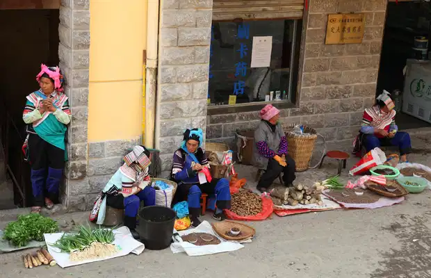 Xinjie désigne la vieille ville par opposition à Nansha, la ville nouvelle dans la plaine. Il s'agit du marché de Yuanyang qui s'étire sur la rue principale, piétonne. Quotidiennement, on vend viande et fruits et légumes dans le bas de la ville. Mais les jours de foire, en principe tous les 5 jours selon le calendrier chinois, les étals grimpent les escaliers et arrivent jusqu'au haut de la ville. On voit alors beaucoup de vêtements ethniques avec leurs décorations en imitation argent. Les brodeuses sont à l'oeuvre toute la journée. Ces jours correspondent à ceux du rat, du singe et du dragon.