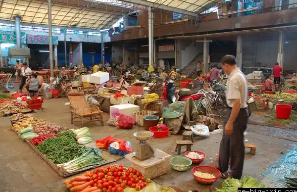 Situé sur la rue principale du village de Yangshuo, le marché couvert est l'un des plus étonnant qu'on ait vu. Typique des marchés chinois, les fruit, légumes, mais aussi viandes et poissons sont simplement présentés sur les étalage, et le système de réfrigération est remplacé par un une petite bande de plastique qui brasse l'air au dessus des produits afin d'empêcher les mouches de se poser. Mais ici, la plupart des étalages sont à même le sol, et avec le climat tropical chaud et humide, l'odeur forte attire les chiens qui apparammeent se promène librement entre les étalages... un spectacle unique