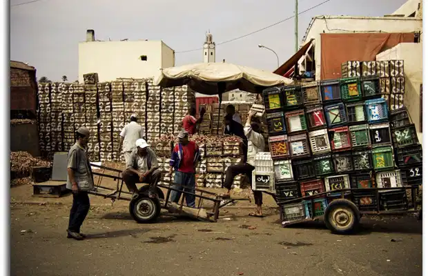 Les caisses vides ou pleines jonchent les allées et les pauvres ânes groulant sous le poids de eur chargement ont du mal à se frayer un passage.