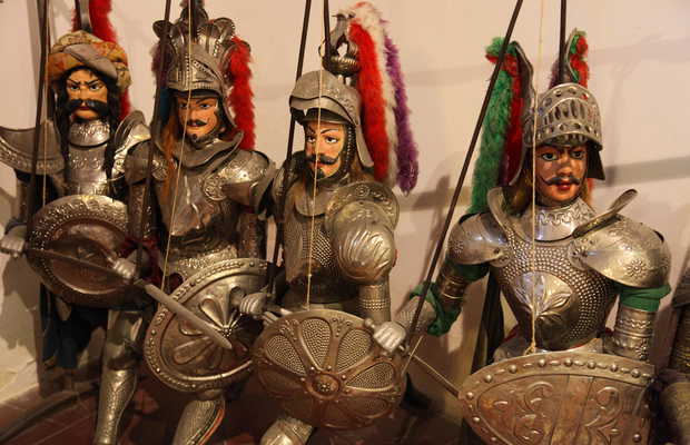 Les marionnettes siciliennes ont eu leur heure de gloire au 19ème siècle. On pense qu'elles sont venues par l'Espagne, avec notamment l'histoire de Don Quichotte. Les récits mettaient en scène des chevaliers médiévaux et les marionnettes ont casque, armure et armes blanches.