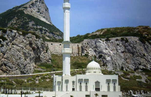 Aussitôt que vous arriviez à la première rotonde, la mosquée reste près de la route d'arrivée à Gibraltar. Elle a été payée par le roi Fahd de l'Arabie Saoudite, et a eu un budget de cinq millions de livres sterling. C'est la mosquée plus au sud de l'Europe, bien qu'elle ne soit pas destinée aux immigrants illégaux. Sa fonction est de s'occuper de la communauté musulmane du Rocher. La mosquée suit une une typologie simple : un haut minaret, une salle de prières, une école religieuse, une bibliothèque et une salle d'actes.