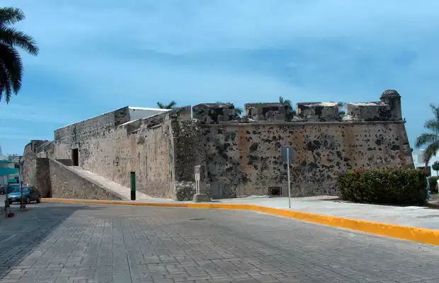 Campeche était un port très prospère dédiée à l'exportation de bois et de colorants, ainsi que l'or et l'argent des régions voisines. Des pirates de Caraïbes ont commencé à l'attaquer six ans seulement après sa fondation en 1540. Pendant deux siècles, la ville a été attaquées par les pirates, violant, brûlant et pillant leur population. En 1668, cinq ans après une attaque brutale par des pirates, la monarchie espagnole a décidé de construire un mur épais de 2.5 km de Forme hexagonale. Le mur avait cinq bastions liant les côtés des mur, qui a agi comme une forteresse où les troupes restaient, en raison de sa grande taille.