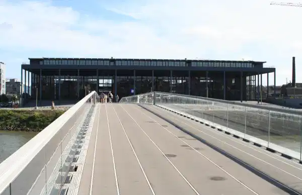 Sur l'île de Nantes, il trône, impressionnant, imposant par sa taille et sa structure. Tout de métal et de verre, de l'extérieur le Palais de Justice semble une forteresse imprenable et a bien l'allure de ce qu'il est : Un tribunal. Construit en 2000 et œuvre de l'architecte Jean Nouvel, il est ouvert au public. Et la surprise attend le visiteur à l'intérieur. Car contrairement à ce que l'on pourrait croire, il est très lumineux. Les colonnes se reflètent, rendant le hall encore plus gigantesque, et la lumière de la ville et des bords de Loire s'engouffre généreusement dans cette entrée monumentale.