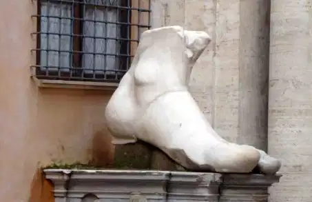 Dans la cour du Palais des Musées du Capitole, vous trouvez une partie des fragments de la statue de Constantin Ier le Grand. Durant son mandat à Rome, il a commencé un programme de construction pour remplir Rome et les villes de l’empire de son image et souvenirs. Ces fragments de la statue colossale sont découverts dans le Forum romain, dans l’abside de l’Ouest de la basilique de Maxence. Cette statue est curieuse, parce qu’il y a des parties nues en marbre, alors que le reste de son corps a été fait en bronze doré et stuc.
