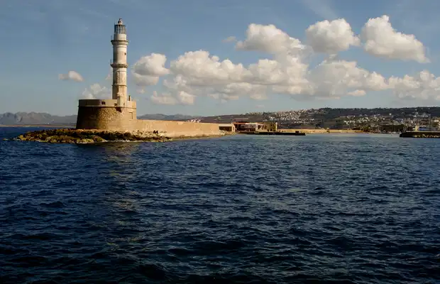Ce phare est un élément majeur du port vénitien. Il contribue largement à la beauté du décor. Sa construction remonte à 1570. Il a été restauré en 1830. Il fait face au fort de Firkas, aujourd'hui occupé par le musée maritime.
