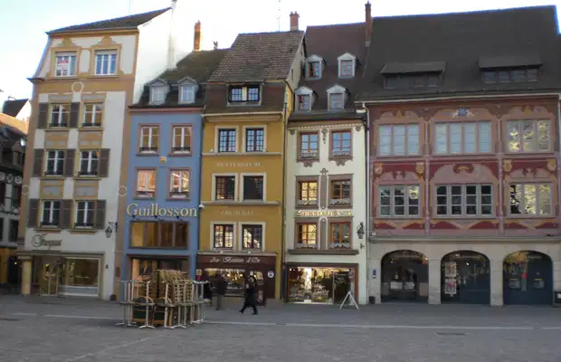 C´est la place centrale de Mulhouse, une jolie place ancienne où se trouve la cathédrale, pavée et piétonne, il y a également l´hôtel de ville, qui a été construit au XVIème siècle, et bon nombre de maisons encore bien préservées, peintes de couleurs vives. On s´attend en cliché à une ville grise, un peu triste, on est presque dans Hansel et Gretel, les maisons basses colorées ont l´air de sortir tout droit d´un dessin animé de Disney.