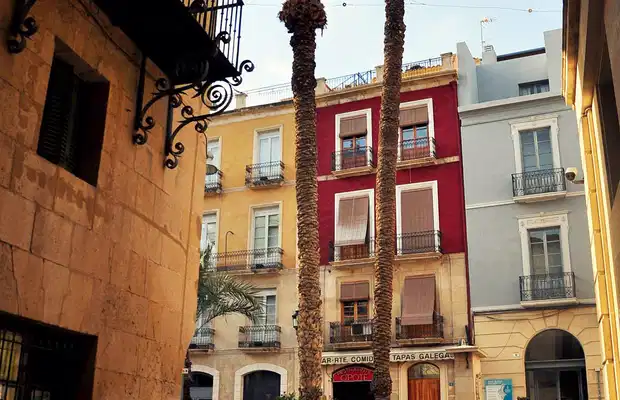 Depuis la belle et colorée place de la Santisima Faz, située derrière la mairie d'Alicante commence véritablement l'immersion dans le vieux Alicante. En effet, à l'image du quartier historique, la place est haute en couleurs: façades de maison rouge, ocre ou orange; palmiers, yuccas et autres plantes exotiques, balcons fleuris, bâtiments de pierre, zone exclusivement piétonne... La place est vraiment très agréable. Plusieurs cafés et restaurants (dont un excellent italien) ont profité de cet emplacement de choix pour installer leurs tables en terrasses. Idéal siroter une boisson fraîche loin de l'agitation du front de mer et du centre-ville ...