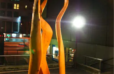 Au centre de la placette une sculpture improbable taillée dans le bois, semblables à des tentacules qui jaillissent de la terre.