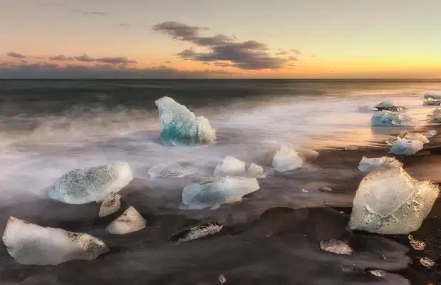 Cette plage est juste au bord de la route 1, côté mer, tandis qu'à quelques secondes de l'autre côté se trouve le lac glaciaire qui est un des plus beaux lieux d'Islande, et une vue incroyable sur les montagnes et sur les énormes glaciers qui plongent dans l'eau.