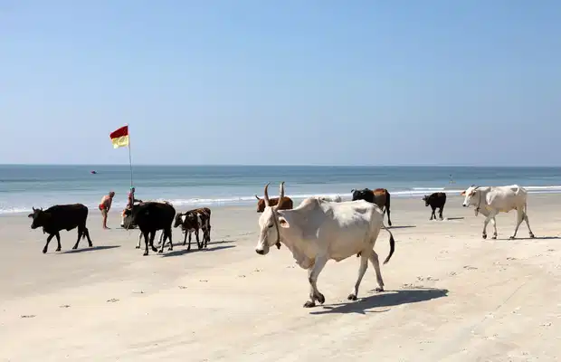 De Colva beach à Benaulim beach, et même au-delà, ce n'est qu'une longue et même plage de sable : magnifique ! Mais il fait souvent un peu chaud en pleine journée. Du coup c'est davantage la marche, ou le vélo qui y sont pratiqués, plutôt que la bronzette sur grill. C'est l'arrivée du tourisme qui a fait se développer des restaurants de plage, car les pêcheurs ont bâti leurs maison davantage en retrait, là où poussent plus volontiers les arbres. En suivant la plage, en direction de Benaulim on trouve beaucoup d'espace, avec les barques à balancier halées sur le sable.