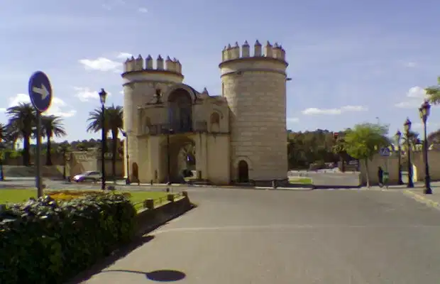 Cette porte qui constitue le symbole et l'emblème de la ville de Badajoz se trouve en face du Pont Palmas, au bord du Guadiana, à proximité du bastion de San Vicente. Elle a été la porte d'entrée la plus importante de la ville, qui abritait le contrôle douanier la prison royale au XIXe siècle. Il ressemble à un arc de triomphe, avec deux grandes tours circulaires crénelées sur les deux côtés du corps central. La porte a deux façades différentes, une de chaque côté. Sur la façade extérieure (vers le fleuve) se trouve le bouclier de l'empereur Charles V et une inscription commémorative. Celle qui donne sur la place a une espèce de terrasse et une niche avec l'image de la Vierge.